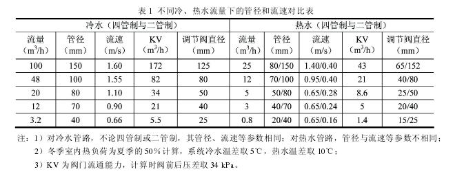 四管制由于冷、熱水管分開,可按各自的設(shè)計(jì)流量和流速選擇管徑,在設(shè)計(jì)流量下均可滿足0.6 m/s~1.0 m/s 以上的流速要求。而對二管制,由于管徑是按夏季水量選擇的,而對冬季水量,其管道就顯得過大,流速會變得很低,不可能有效的排除系統(tǒng)中的空氣,從而造成大樓各部位冷熱不均。如我院 8 號病房樓二管制空調(diào),夏季運(yùn)行尚可,冬季開一臺泵出現(xiàn)嚴(yán)重冷熱不均,開二臺泵才夠,即與夏季水量相同才基本滿足要求。這無疑會造成過量輸水的能源浪費(fèi)。所以要求二管制管道具有一定的坡度,比要求單純熱水管具有坡度,更為必要。